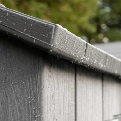 The Lifetime 15 ft x 8 ft Dual Entry shed: rough cut vertical siding, (2) sets of 8 pane window doors, (2) windows, and (2) sets of shutters, (1) 90 in. shelf, and (12) wall hooks. Comes with a 10-year warranty.