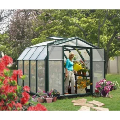 Hobby Gardener 8×8 Greenhouse is attractive, durable and easy to assemble. The sturdy frame is constructed from UV protected resin and held together with pin and lock resin connectors. The virtually unbreakable twin-wall polycarbonate panels offer superior strength, safety, light diffusion and heat insulation. All these features plus an easy, no-tool assembly makes the Hobby Gardener Greenhouse perfect for the growing enthusiast’s needs.