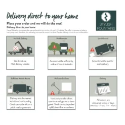 | Additional Information | If this fountain is being installed outside then it is recommended that you use a qualified electrician. This product is hand stained and crafted therefore variations will occur. Please ensure you meet the delivery criteria for this product prior to ordering. Home deliveries are made to the nearest kerbside/hard standing with a tail-lift vehicle. The pallet is manoeuvred using a hand pump truck therefore the unloading area must be smooth and level. |