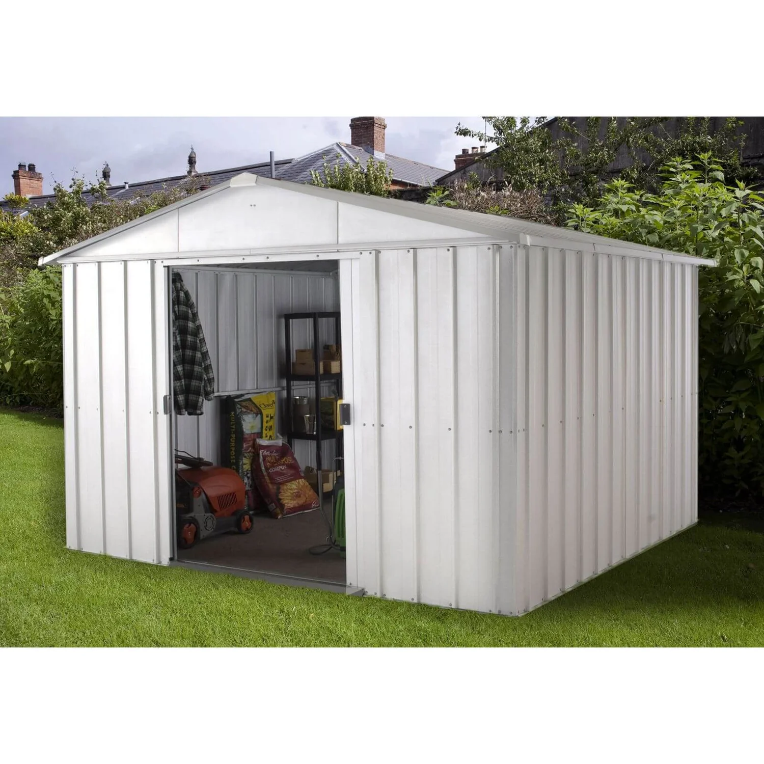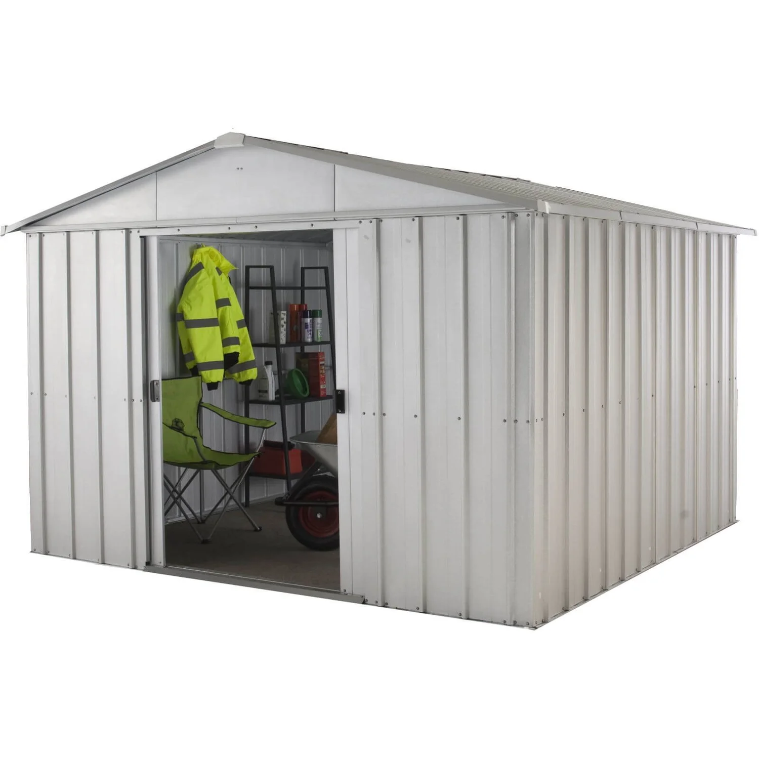 The Yardmaster Apex Roof Metal Shed 10ft x 8ft has double sliding doors and offers a practical storage solution for any garden.